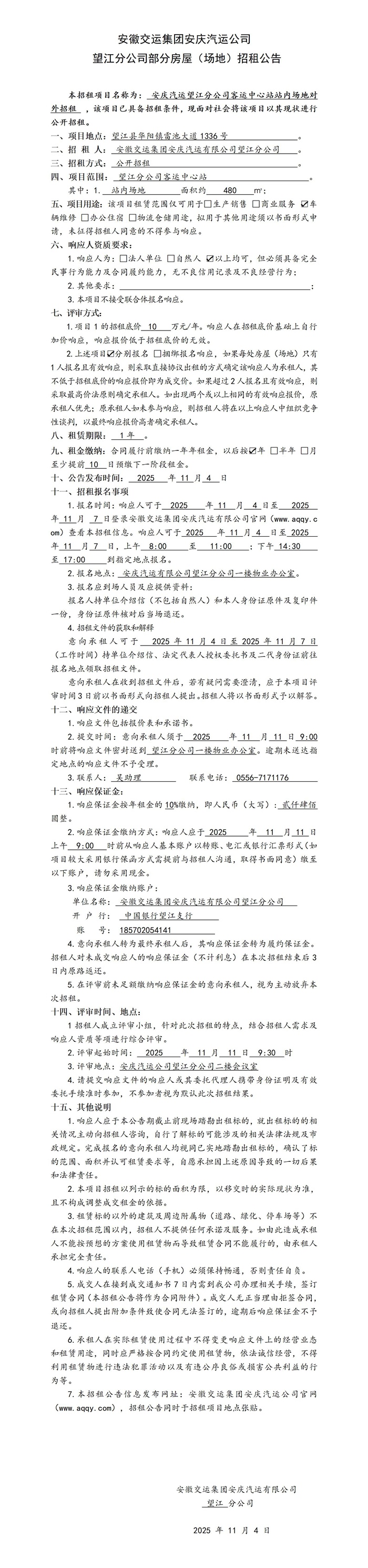 望江分公司部分房屋(場(chǎng)地)招租公告