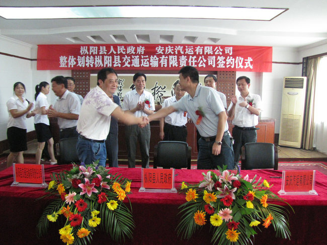 2011年9月1日,樅陽縣人民政府、安徽省交通集團(tuán)安慶汽運有限公司整體劃轉(zhuǎn)樅陽縣交通運輸有限責(zé)任公司簽約儀式在樅陽迎賓館會議大廳內(nèi)隆重舉行。樅陽縣縣長何謙、副縣長胡海峰,省交通集團(tuán)汽車運輸有限公司副總經(jīng)理方詩喬,安慶汽運有限公司董事長張進(jìn)、黨委書記徐軍、副總經(jīng)理王中明、彭宏、紀(jì)委書記郭峰,樅陽縣交通運輸有限責(zé)任公司經(jīng)理童子健出席了簽約儀式。
