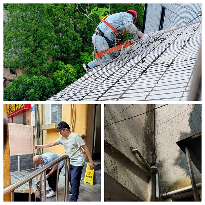8月安全巡查期間,綜合服務(wù)中心安全科針對紡織南路7號樓及周邊區(qū)域開展專項隱患排查,發(fā)現(xiàn)兩處亟待處理的安全問題:一是7號樓公廁外側(cè)落水管多處破裂,導致雨水滲漏至路面并形成大面積積水,不僅影響市容環(huán)境,更對過往車輛及行人構(gòu)成潛在風險;二是慶達綜合樓頂層臨街面瓷磚多處開裂,縫隙中滋生的灌木根系已侵入建筑結(jié)構(gòu),存在高空墜物隱患,嚴重威脅公共安全。